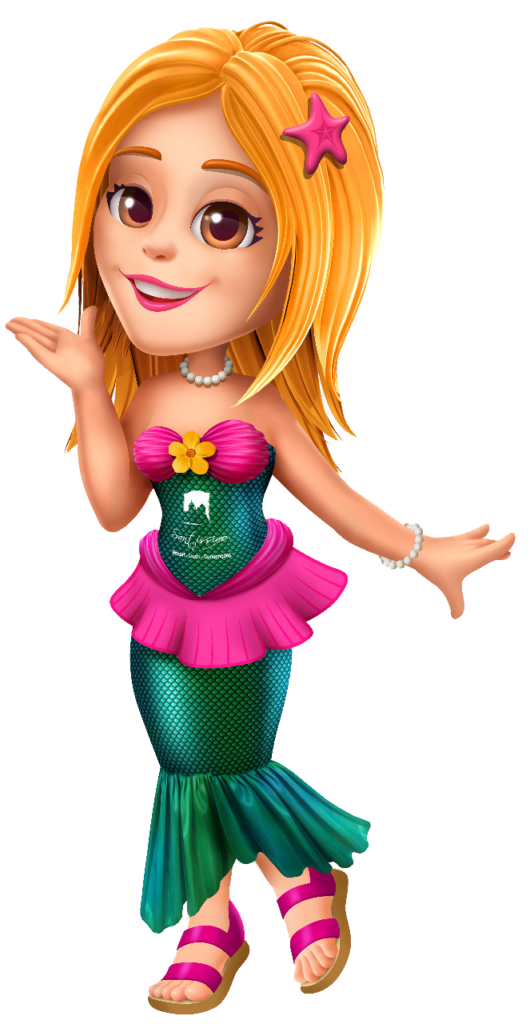 É uma boneca meiga, sorriso encantador. Ela representa o Aqua Ventura, espaço de muita diversão composto com muita água, brinquedos aquáticos e uma praia.